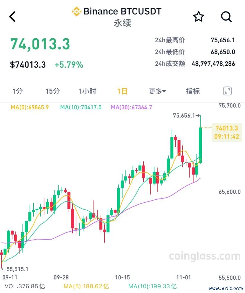 北京时间11月6日,虚拟货币市场大爆发。比特币此前盘中站上75000美元/枚,创下历史新高,截至记者发稿时,比特币价格回落至74000美元一线,日内涨幅收敛至6%左右。此外,狗狗币大涨10%。交易所运营商Coinbase大涨超15%,而MicroStrategy上涨超10%。