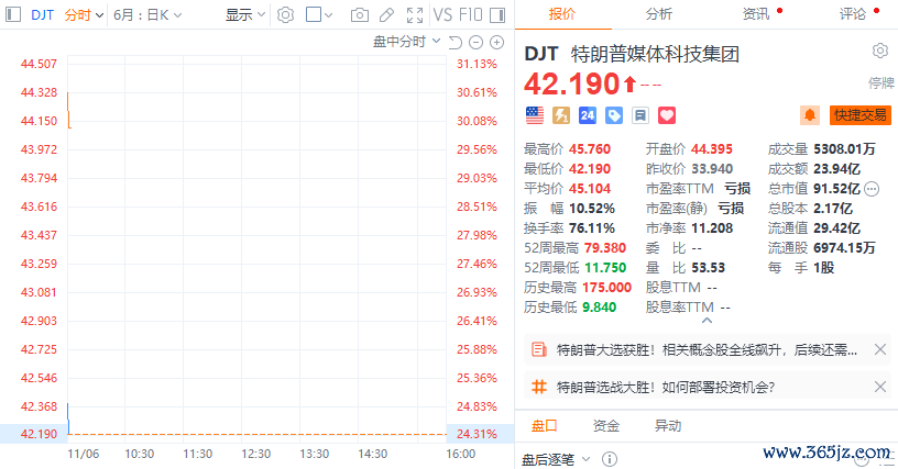 特朗普媒体科技集团盘初因波动性停牌,停牌前涨幅超24%,报42.19美元/股;特斯拉开盘大涨13%,股价创2023年7月以来新高。
