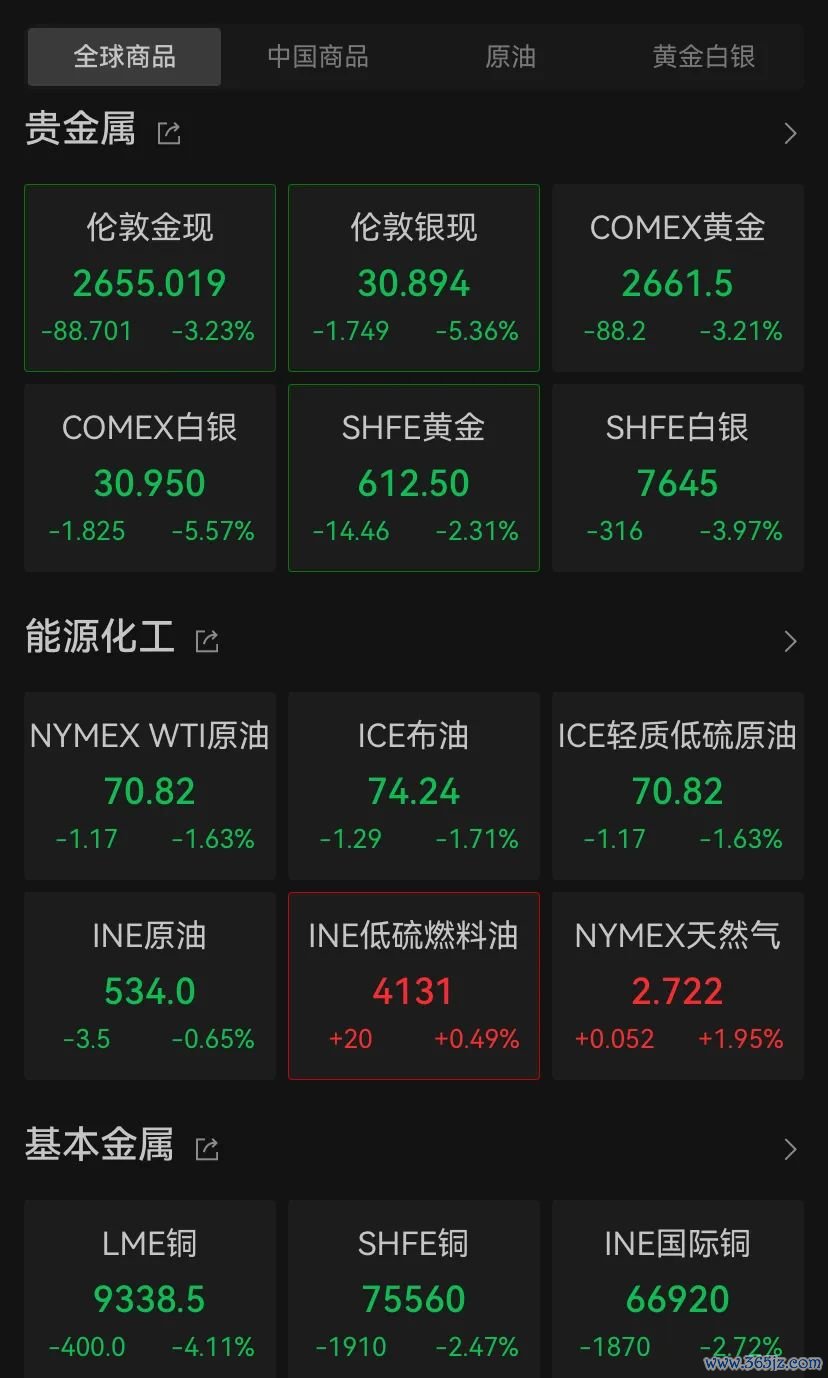 以美元计价的全球大宗商品普遍承压,金银铜油价格齐跌。截至记者发稿时,现货黄金跌破2700美元/盎司,日内跌幅超3%,创下自今年6月7日以来的最大跌幅;现货白银大跌超5%,报30.894美元/盎司。WTI原油、布伦特原油双双跌超1.5%;COMEX铜期货跌逾4.8%,报4.257美元/磅,LME期铜跌4%,报9348美元/吨。